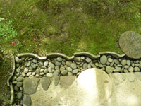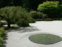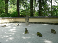 Toinen, yhtä kiinnostava paikka oli hiekkapuutarha. Se sijaitsi suuren paviljongin vierellä. Rakennuksen pitkältä verannalta aukesi suora näkymä koko puutarhaan. Tämän puutarhan sivustoilla oli puita ja istutuksia, joten näkymä ei ollut yhtä askeettinen kuin edellisessä puutarhassa. Lisäksi hiekkakentällä oli kaksi vihreää ’saarta’, joihin oli istutettu matalia kasveja. Toinen ’saari’ oli ympyrän muotoinen ja toinen oli muodoltaan epäsymmetrinen. Minulle kerrottiin, että ’saaret’ esittävät sakekuppia ja kurpitsaa; molemmat ovat onnellisuuden symboleja.