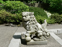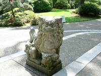 Ylhäällä kukkulalla pääsisäänkäyntiä vartioivat harmaasta kivestä veistetyt uros- ja naaraslohikäärme. Ne symbolisoivat puutarhan kahta hallitsevaa elementtiä: maskuliinista ja feminiinistä prinsiippiä. Kummallakin oli omat tunnuksensa. Uros painoi käpälänsä alle maapalloa. Naaraalla puolestaan oli mukanaan lohikäärmeenpentu. Se muistutti kovasti vanhempiaan ja näytti koko ajan haluavan karkuun emonsa painavan tassun otteesta. Vaikea sanoa, näyttikö kolmikko enemmän hurjalta vai leikkisältä … Olipa asia miten vain, veistokset vetosivat hyvin voimakkaasti katsojaansa, jopa niin paljon, että joku oli joskus salaa vienyt ne mukaansa. Tapahtuman jälkeen lohikäärmeistä oli teetetty kopiot ja ne oli asetettu uudelle paikalle porttien sisäpuolelle.