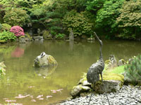 Japanilaiseen puutarhaan kuuluu oikeastaan viisi eri tyylistä puutarhaa. Aluetta kiertäessään voi noudattaa reittiä, joka kulkee jokaisen puutarhan läpi. Kuljin tämä reitin ystävällisen oppaan seurassa. Reitin ensimmäinen maisemakokonaisuus rakentuu kahden suurehkon lammen ympärille. Pohjoisessa on ylempi lampi kuunsiltoineen. Etelässä on alempi lampi, jota koristavat kilpikonnaa ja kurkia esittävät patsaat.
