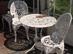 Jotenkin noista koristeellisista tuoleista ja pöydästä tulee mieleen aurinkokello, se miten kellon heittämä varjo siirtyy maassa auringon liikkeen myötä. Tuossa ei kuitenkaan ole ajanmittauslaitetta, vaan tapaamispaikka kahdelle ihmiselle ja keskustelulle joka -mahdollisesti voisi koskea aurinkoista päivää ja valon luomaa hyvänolontunnetta, iloa ystävän kohtaamisesta ja siitä millaisia varjoja luomme toisiimme ja kaikkiin kanssaihmisiimme, jos ajattelemme todellisuutta tilana ja valoisuuden asteina ja sen piirissä elävää ihmistä liikkumassa hämärän vyöhykkeeltä toiselle, valkoisesta mustaan, vuoroin tummuudessa, hämäryydessä, himmeässä; kylmeten ja lämmeten, aina heittämässä varjoja olemassaoloonsa?